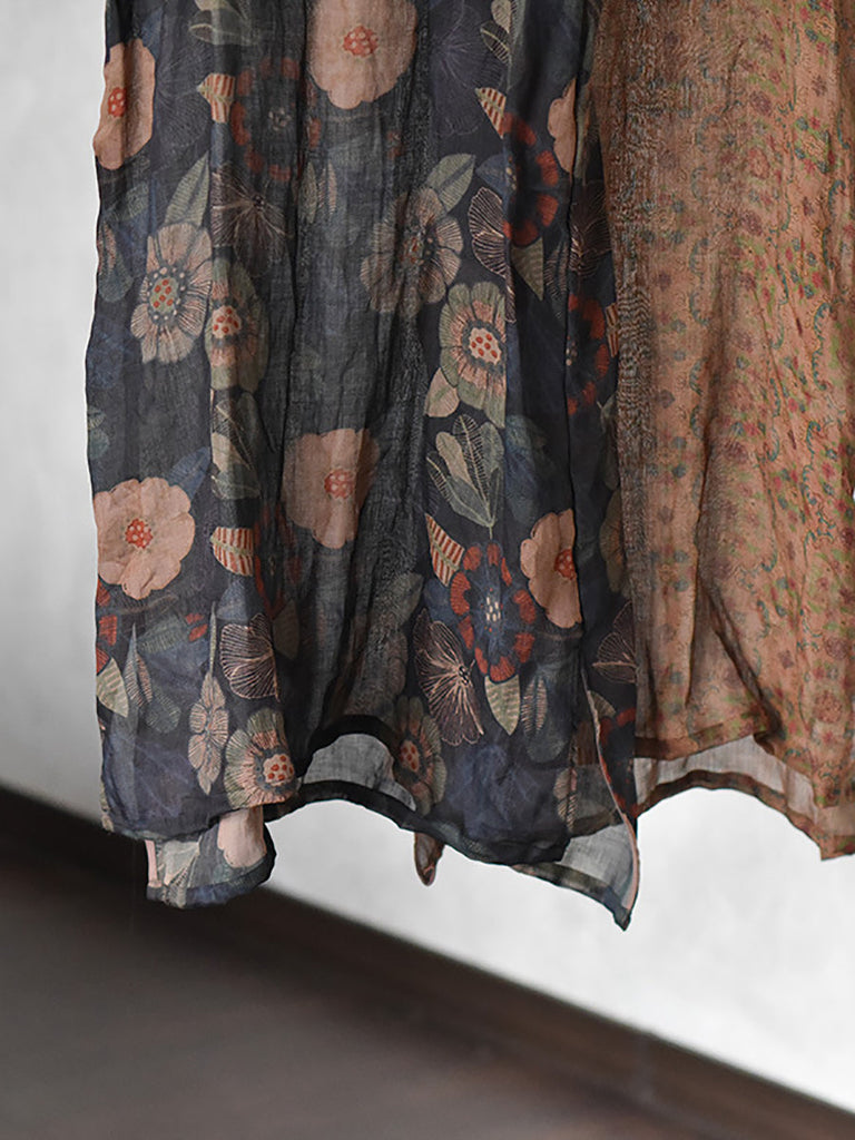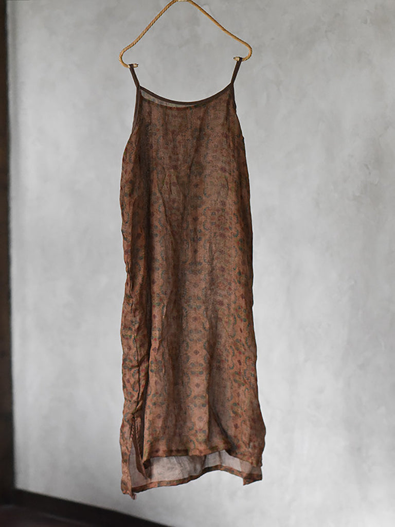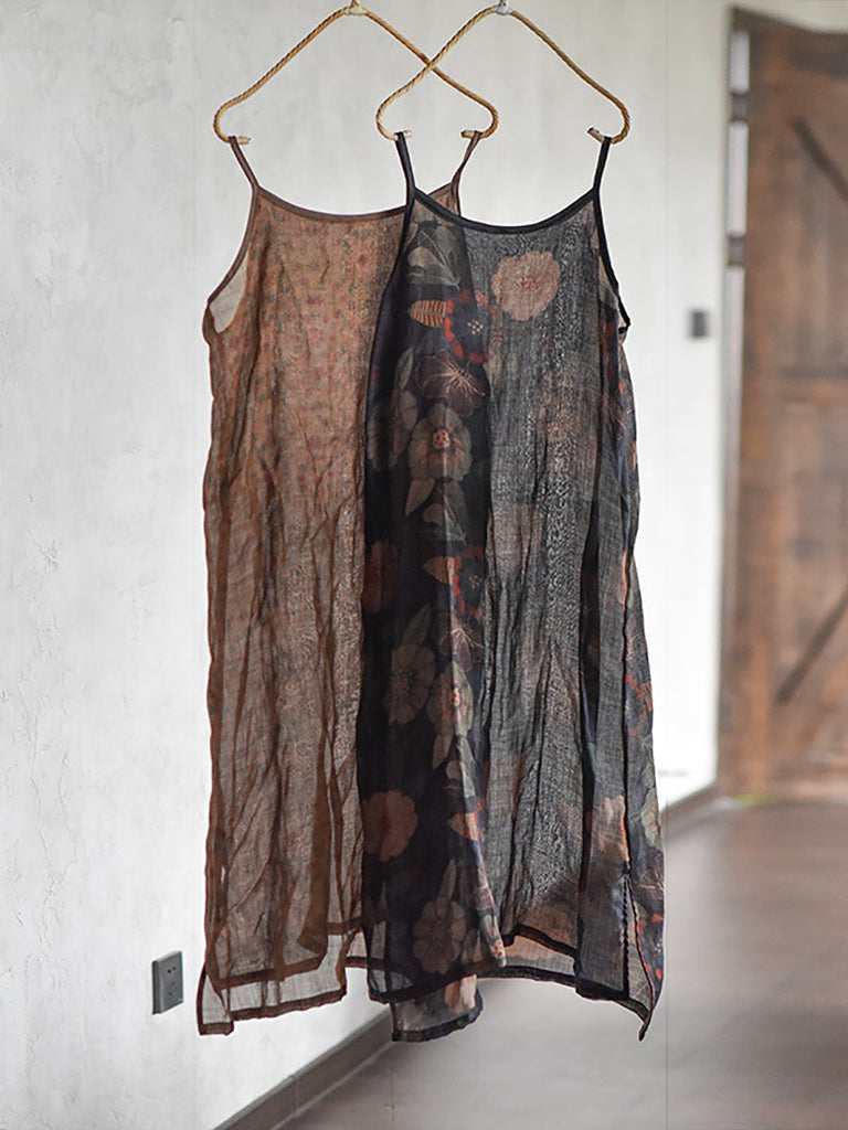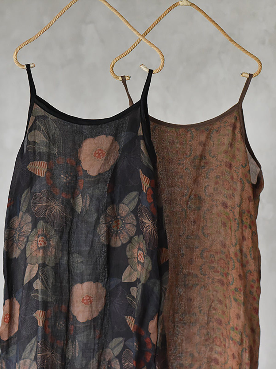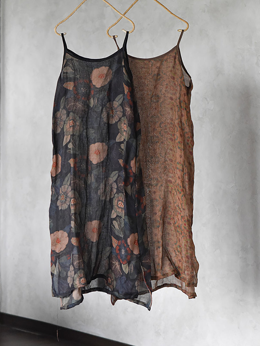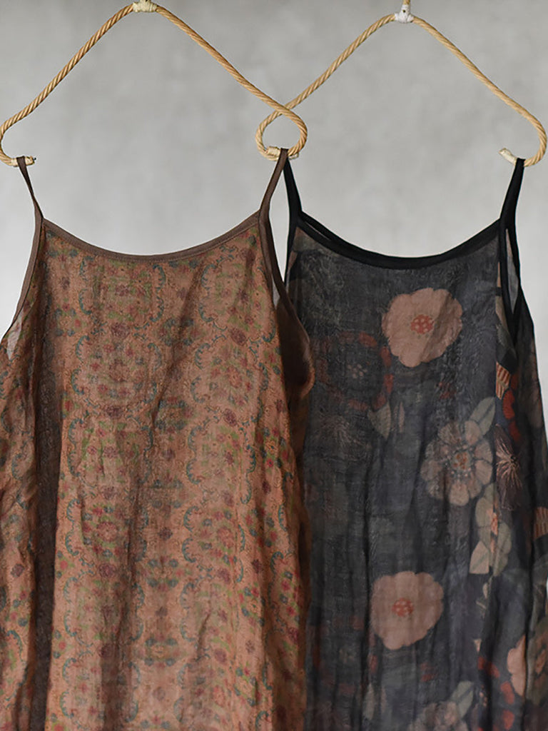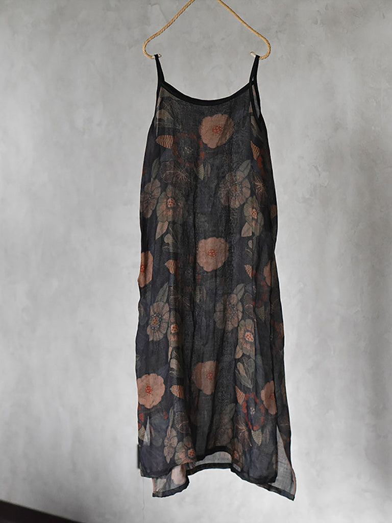 Plus Size Women Summer Vintage Ramie Floral Thin Vest Dress